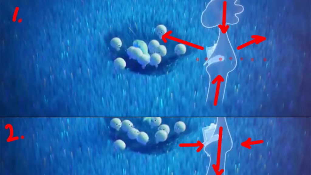 Squash and Stretch: Jerry’s abstract 2D design allows for flexible shape transformation. In picture 3, there is a noticeable stretch when Jerry changes her shape to move underground and shift her position, resembling water flowing into the soil. When she returns to the surface, her body slightly rebounds.This helps the audience understand that Jerry is a fluid and flexible creature.