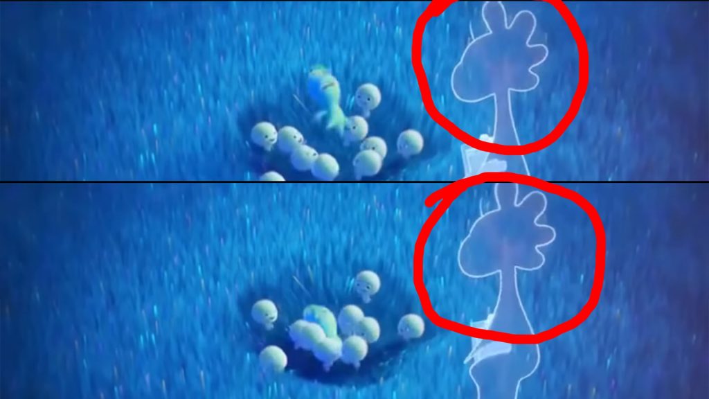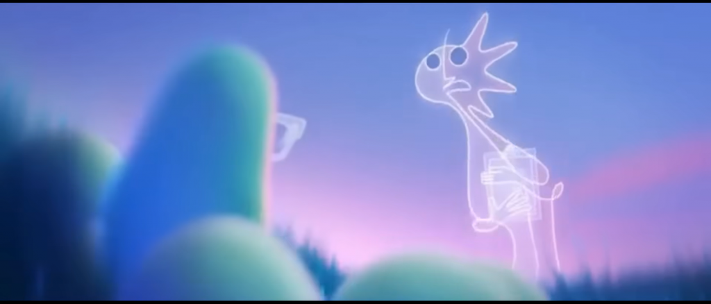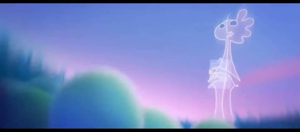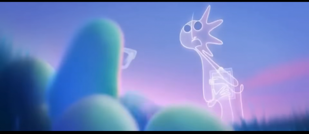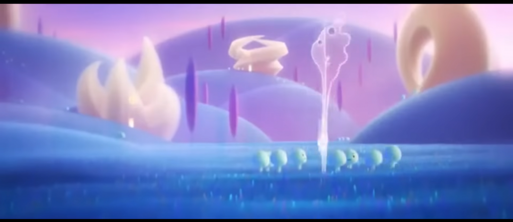 Staging: In this clip, this is the first time Joe meets Jerry. The staging clearly shows Jerry’s status within the Great Before. Jerry is taller and larger than the surrounding souls (picture 1.), which immediately draws the audience’s attention and suggests that this character holds a higher status than others. The audience may also be reminded of interaction between elders and children, such as a parent and child or teacher and students. In Picture 2, low-angle shot reinforce the audience’s impression of Jerry’s status, although her tone is gentle and friendly.